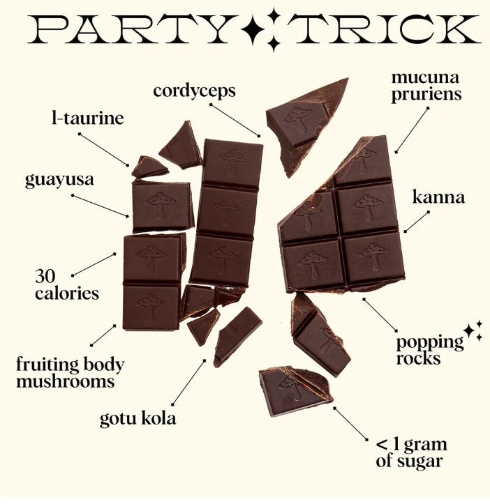 Crafted with a powerful blend of functional mushrooms and mood-supporting botanicals, this unique chocolate delivers both an instant uplift and long-term wellness benefits. Whether you're heading out, meeting friends, or simply want to shift your energy, Party Trick is your go-to ritual for feeling more open, present, and connected.